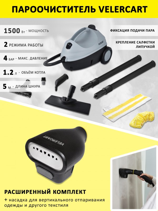 Пароочиститель для дома (паровая швабра) VELERCART V2 + насадка для вертикального отпаривания одежды