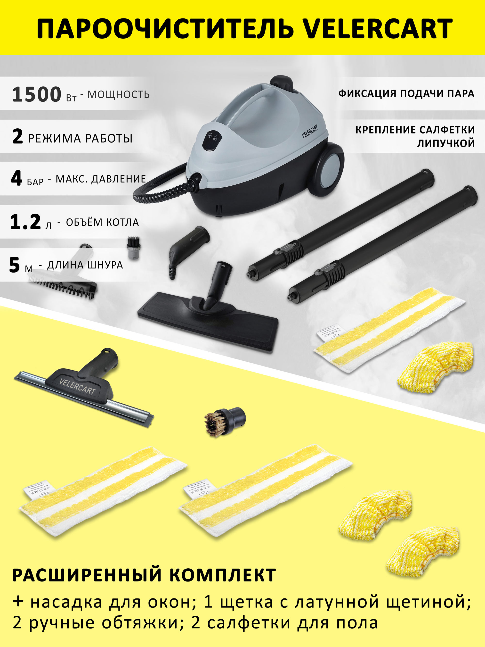 Пароочиститель VELERCART V2 + 2 салфетки для пола, 2 обтяжки для ручной насадки, 1 латунная щёточка, насадка для мытья окон