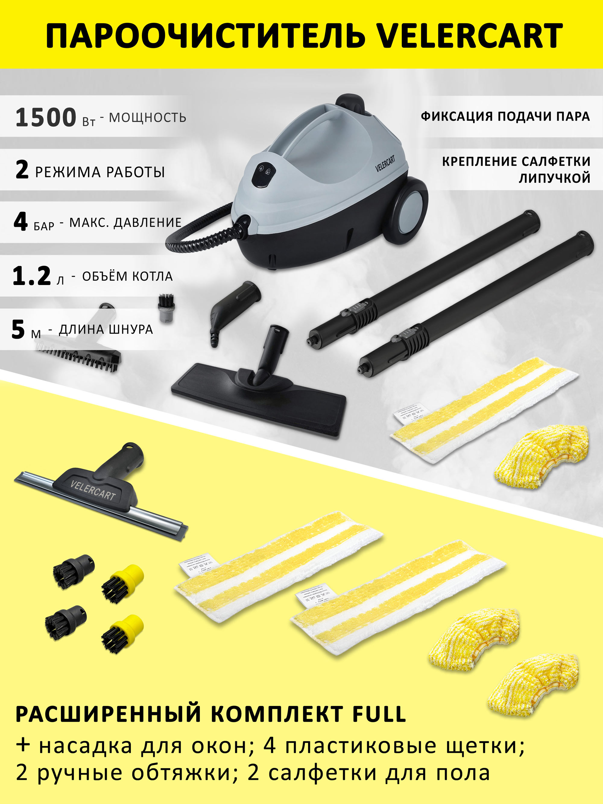 Современный пароочиститель VELERCART V2 поможет вам в уборке всей квартиры! Это версия с расширенным комплектом Full.